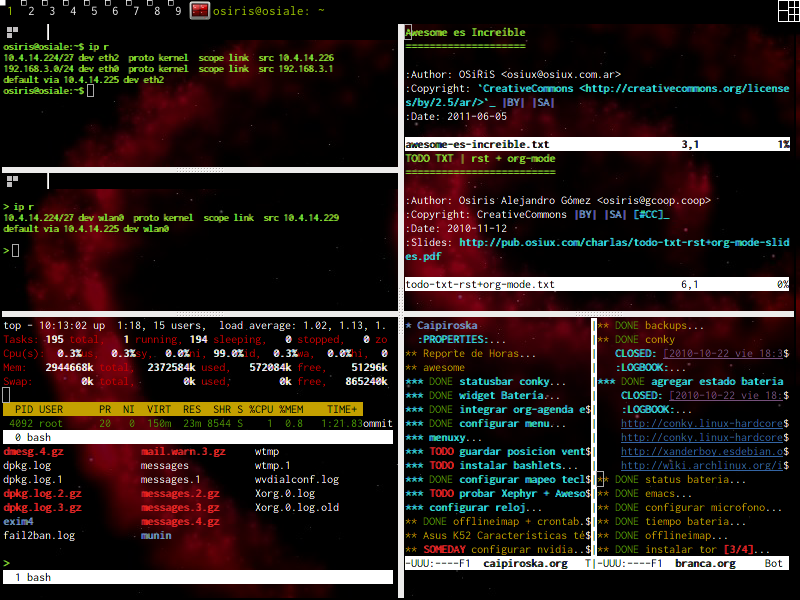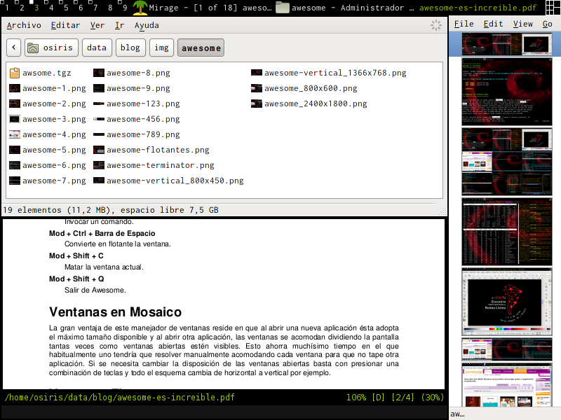Pero luego me di cuenta que pasaba mucho tiempo jugando con la ubicación de las ventanas, así que emprendí la búsqueda de una alternativa tan liviana y minimalista como lo era fluxbox, así llegué a awesome 5 que significa increíble, se pronuncia osom o algo así, yo prefiero decirle aguesome.
