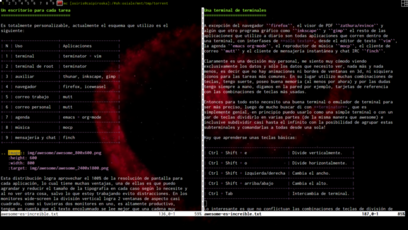 Entonces para todo esto necesito una buena terminal o emulador de terminal para ser más preciso, luego de mucho buscar di con terminator, que es simplemente genial, en principio puedo usarlo como una simple terminal o con un par de teclas dividirlo en varias partes (de la misma manera que awesome) e inclusive subdividir casi hasta el infinito con la posibilidad de agrupar estas subterminales y comandarlas a todas desde una sola!