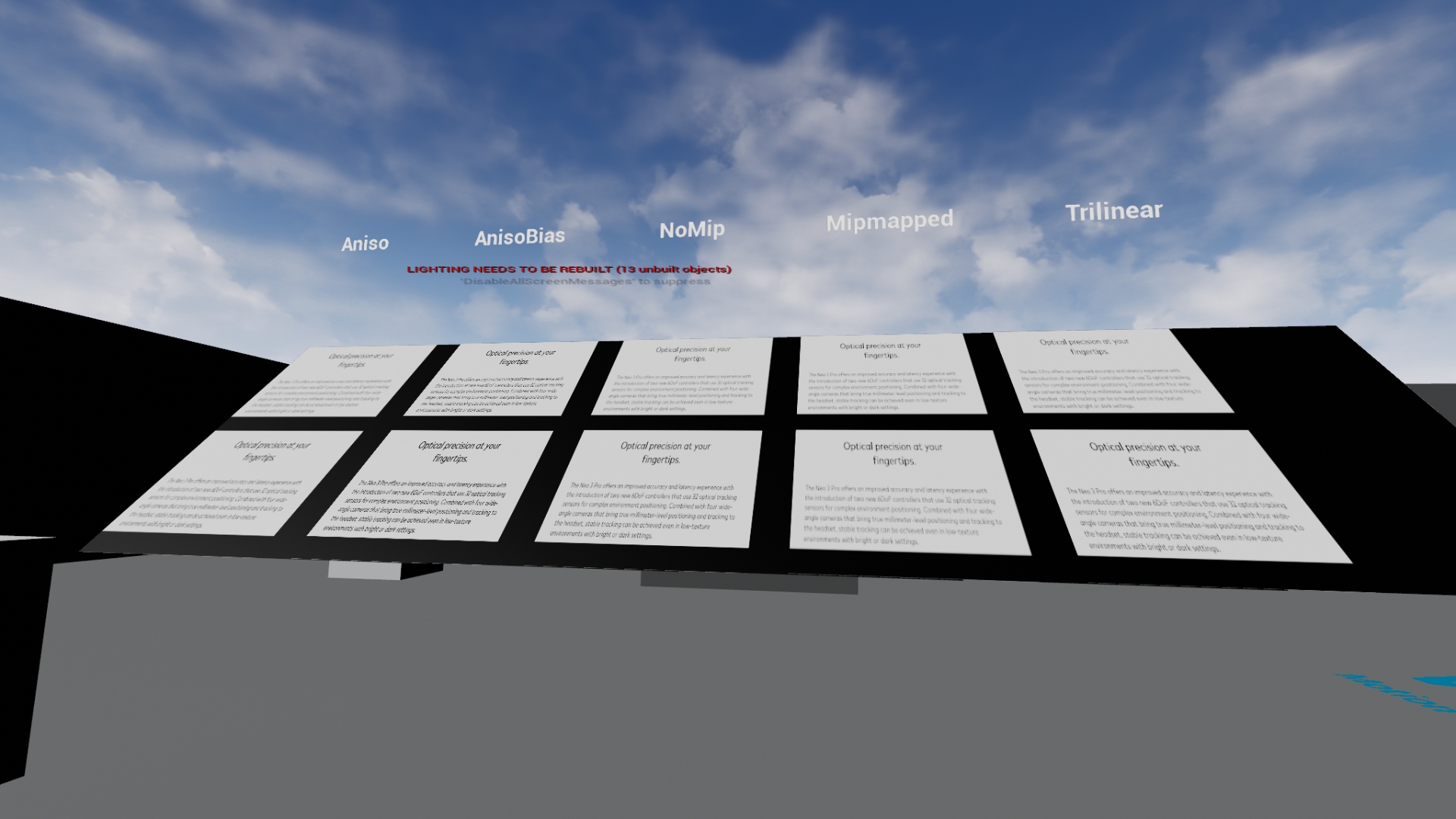 Demonstrate different texture setups (aniso, aniso bias, mipmap, trilinear) work for text pictures on Pico platoform. And compare how stereo layer display text pictures versus non-stereolayer.