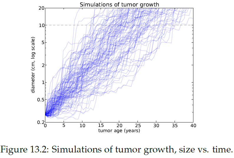"Figure13.2에서 종양 나이에 따른 종양 크기를 시뮬레이션한 결과를 볼 수 있음. 10cm에서 점선은 이 크기에 대한 종양의 나이 범위를 나타내며, 빠르게 자라는 종양은 8년, 느리게 자라는 종양은 35년 이상이 걸림.\n",