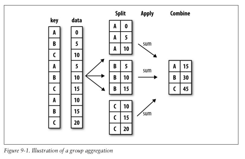 " ], "text/plain": [ " 0 1 2 3\n", "5 -0.539741 0.476985 3.248944 -1.021228\n", "97 -0.774363 0.552936 0.106061 3.927528\n", "102 -0.655054 -0.565230 3.176873 0.959533\n", "305 -2.315555 0.457246 -0.025907 -3.399312\n", "324 0.050188 1.951312 3.260383 0.963301\n", "400 0.146326 0.508391 -0.196713 -3.745356\n", "499 -0.293333 -0.242459 -3.056990 1.918403\n", "523 -3.428254 -0.296336 -0.439938 -0.867165\n", "586 0.275144 1.179227 -3.184377 1.369891\n", "808 -0.362528 -3.548824 1.553205 -2.186301\n", "900 3.366626 -2.372214 0.851010 1.332846" ] }, "execution_count": 364, "metadata": {}, "output_type": "execute_result" } ], "source": [ "data[(np.abs(data)>3).any(1)]" ] }, { "cell_type": "markdown", "metadata": {}, "source": [ "## 데이터 그룹 연산" ] }, { "cell_type": "markdown", "metadata": {}, "source": [ "그룹 연산 = 분리-적용-결합" ] }, { "cell_type": "markdown", "metadata": {}, "source": [ "" ] }, { "cell_type": "code", "execution_count": 365, "metadata": { "collapsed": false }, "outputs": [ { "data": { "text/html": [ "