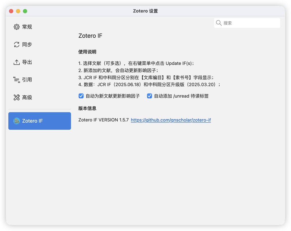# ZotIF Update IF for Zotero Items. ## 🔧 使用说明 1. 🎓 选择(可多选)文献,在右键菜单中点击 Update IF(s)。 2. 🏷️ 新添加的文献,会自动更新 JCR IF 和中科院分区。 3. 📌 JCR IF 和中科院分区分别在【文库编目/Library Catalog】和【索取号/CallNumber】字段显示; 4. ✅ 数据:JCR IF(`2025.06.18`)和中科院分区升级版(`2025.03.20`);
