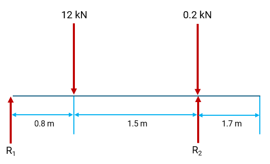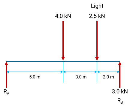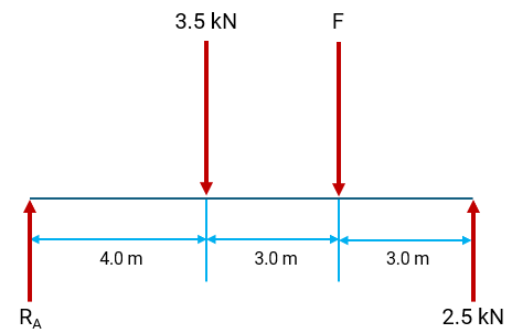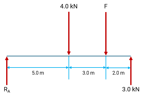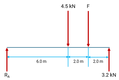 The bridge is supported at points RA and RB. A downward force of 4.5 kN is applied 6.0 m from RA, and the reaction force at RB is 3.2 kN. Calculate the force F by taking moments about RA. Answer correct to 2 s.f.