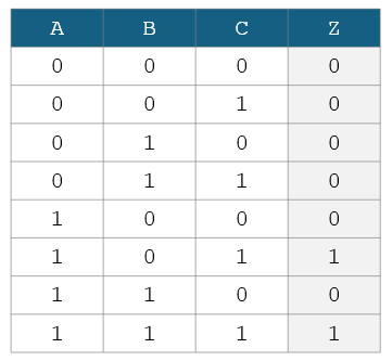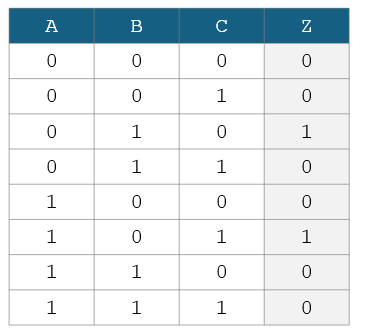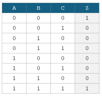 Which of the following show the Boolean equation for output Z in terms of inputs A, B and C?