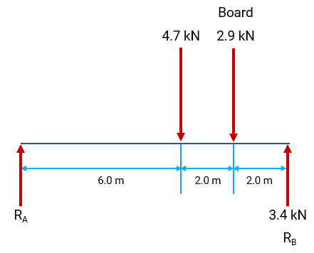 The bridge is supported at points RA and RB. A downward force of 4.7 kN is applied 6 m from RA, and the reaction force at RB is 3.4 kN. The advertising board gives a downward force of 2.9 kN.