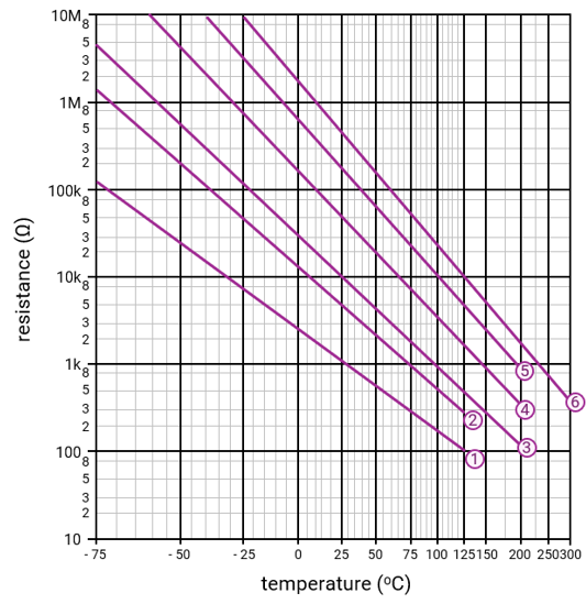 State the thermistor number from the graph below that has a resistance of 20 kΩ when the temperature is 50 °C.