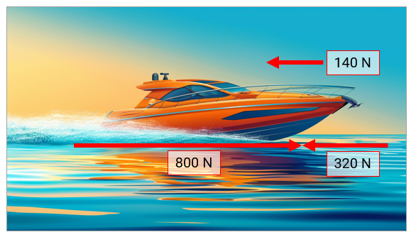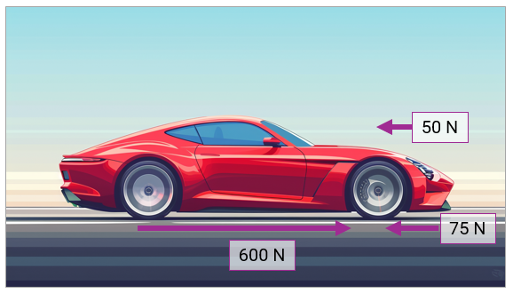 The car in the image below is travelling with a forward force of 600N, against the force of friction on the road of 75N, and an air resistance of 50N.