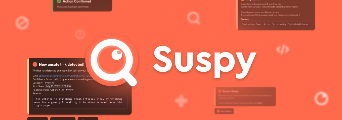 Suspy is a bot for discord (and telegram soon), to help automatically scan and moderate suspicious link (like scam/phish/etc.) sent on your server, with the help of AI powered scan tool.