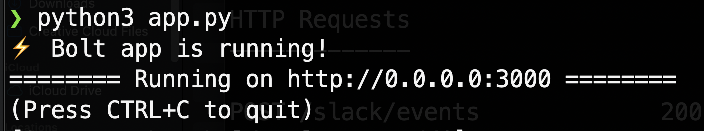10. Make sure you have followed the steps in [Cloning the repo](#Cloning-the-repo). To start the bolt app. The HTTP server is using a built-in development adapter, which is responsible for handling and parsing incoming events from Slack on port 3000