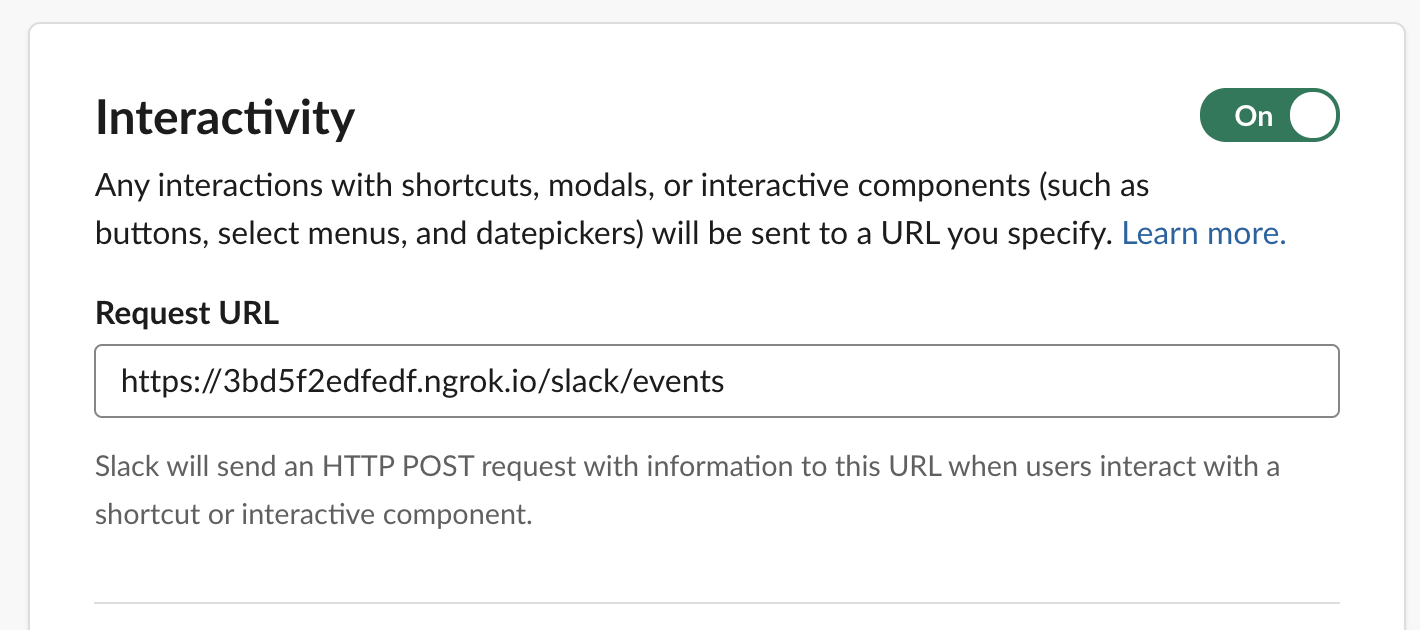 12. Next up select the _Interactivity & Shortcuts_ sidebar and toggle the switch as on. Again for the Request URL enter your ngrok URL appended with /slack/events