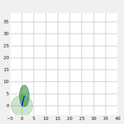 " ] }, "metadata": {}, "output_type": "display_data" } ], "source": [ "dt = 0.6\n", "x = np.array([0., 5.])\n", "F = np.array([[1., dt], [0, 1.]])\n", "P = np.array([[1.5, 0], [0, 3.]])\n", "plot_covariance_ellipse(x, P, edgecolor='r')\n", "\n", "for _ in range(5):\n", " x = np.dot(F, x)\n", " P = np.dot(F, P).dot(F.T)\n", " plot_covariance_ellipse(x, P, edgecolor='k', ls='dashed')\n", "book_plots.set_labels(x='position', y='velocity')" ] }, { "cell_type": "markdown", "metadata": {}, "source": [ "You can see that with a velocity of 5 the position correctly moves 3 units in each 6/10ths of a second step. At each step the width of the ellipse is larger, indicating that we have lost information about the position due to adding $\\dot x\\Delta t$ to x at each step. The height has not changed - our system model says the velocity does not change, so the belief we have about the velocity cannot change. As time continues you can see that the ellipse becomes more and more tilted. Recall that a tilt indicates *correlation*. $\\mathbf F$ linearly correlates $x$ with $\\dot x$ with the expression $\\bar x = \\dot x \\Delta t + x$. The $\\mathbf{FPF}^\\mathsf T$ computation correctly incorporates this correlation into the covariance matrix.\n", "\n", "Here is an animation of this equation that allows you to change the design of $\\mathbf F$ to see how it affects shape of $\\mathbf P$. The `F00` slider affects the value of F[0, 0]. `covar` sets the intial covariance between the position and velocity($\\sigma_x\\sigma_{\\dot x}$). I recommend answering these questions at a minimum\n", "\n", "* what if $x$ is not correlated to $\\dot x$? (set F01 to 0, the rest at defaults)\n", "* what if $x = 2\\dot x\\Delta t + x_0$? (set F01 to 2, the rest at defaults)\n", "* what if $x = \\dot x\\Delta t + 2x_0$? (set F00 to 2, the rest at defaults)\n", "* what if $x = \\dot x\\Delta t$? (set F00 to 0, the rest at defaults)" ] }, { "cell_type": "code", "execution_count": 37, "metadata": {}, "outputs": [ { "data": { "image/png": "iVBORw0KGgoAAAANSUhEUgAAA2oAAAGACAYAAADca5HGAAAABHNCSVQICAgIfAhkiAAAAAlwSFlzAAAPYQAAD2EBqD+naQAAADh0RVh0U29mdHdhcmUAbWF0cGxvdGxpYiB2ZXJzaW9uMy4xLjMsIGh0dHA6Ly9tYXRwbG90bGliLm9yZy+AADFEAAAgAElEQVR4nOzdd3wUdfrA8c+mk0ZJCCQEEkqooVioIqIUQfBElGo5FSygnv7O3jn0bOd59n4CnoKFIirFjigIWCmhJYEAIYGEENLLtt8fX7IlBNJ2d2Z3n/frxYudmZ3ZZ/fZmcyz853v12C1Wq0IIYQQQgghhNCNAK0DEEIIIYQQQgjhTAo1IYQQQgghhNAZKdSEEEIIIYQQQmekUBNCCCGEEEIInZFCTQghhBBCCCF0Rgo1IYQQQgghhNCZIK0D8AYWiwWLxeI0z2AwYDAYNIpICCGEEEIIoUdWq5XaI6AFBAQQENC4a2RSqDWAxWKhrKxM6zCEEEIIIYQQXigiIqLRhZo0fRRCCCGEEEIInZFCTQghhBBCCCF0Rgo1IYQQQgghhNAZuUetAerqNKQp7UyFEEIIIYQQvq2u/i2a0gmhFGoNUNcH25SeW4QQQgghhBD+pymFmlQaQgghhBBCCKEzckVNeJ29e/diMpkICgqie/fuWofjtyQP+iB50J7kQB8kD/ogedAHyYNvkEJNeJ2KigqMRiPBwcFah+LXJA/6IHnQnuRAHyQP+iB50AfJg2+Qpo/C6xgMBts/oR3Jgz5IHrQnOdAHyYM+SB70QfLgGwxWq9WqdRB6Z7FYKCkpcZoXFRUlnYkIIYQQQgghnLiqdvDqSqOkpIR7772XsWPH0rZtWwwGA/PmzWvQugsXLnT6tcHx35EjR9wbuBBCCCGEEEKcgVffo1ZQUMBbb71F//79mTRpEu+8806jt7FgwQJ69uzpNC8mJsZVIQohhBBCCCFEo3l1oZaUlERhYSEGg4Fjx441qVBLTU3l3HPPdUN0QgghhBBCCNE0Xl2oyQ2S/ik/Px+z2UxgYCBt27bVOhy/JXnQB8mD9iQH+iB50AfJgz5IHnyDVxdqrjBx4kTy8/Np2bIlI0eOZP78+aSmpmodljiDnJwcW5ezcvDRjuRBHyQP2pMc6IPkQR8kD/ogefANfluotW/fnoceeoghQ4YQHR3N9u3befrppxkyZAgbNmygf//+Z1w/LS2NpKQkoqOjbfOqqqrYvXs3AK1bt6ZTp05O66Snp1NeXg5wyvaPHTvG4cOHAejUqROtW7e2LTObzezYsQNQPcZ06dLFad39+/dTXFwMQJ8+fQgKsqf1xIkTHDhwAICEhIRTdtZt27ZhtVpp0aLFKQMiHjp0iOPHjwPQo0cPwsLCbMtKS0vJzMwEIC4ujvj4eKd1d+7caTtA9O7d22lZbm4ueXl5AHTt2pXIyEjbssrKSvbs2QNAmzZt6Nixo9O6e/fuxWg0Upf8/HxycnIA1Sy2VatWtmUmk4m0tDQAoqOj6dy5s9O6+/bts/XOk5qaSmBgoG1ZYWEhBw8eBKBDhw7ExsY6rbt161YAwsPDSUlJcVp28OBBCgsLAejZsyehoaG2ZcXFxezfvx+Adu3a0b59e6d109LSMJlMhIaGnnIfZU5ODvn5+QB069aNiIgI27Ly8nLS09MBdb9lYmKi07p79uyhsrKSwMDAU36UyMvLIzc3F4Dk5GRatmxpW1ZdXc2uXbsAnObXyMzMpLS0FIC+ffs69WxUUFBAdnY2AImJiU73gVosFrZv3w5AZGQkXbt2ddpuVlYWRUVFAPTq1YuQkBDbsqKiIrKysgCIj48nLi7Oad0dO3ZgNpsJCwujR48eTsuys7MpKCgAICUlhfDwcNuysrIyMjIyAGjbti0JCQlO6+7evZuqqiqCgoLo06eP07IjR45w9OhRADp37uyRYwSA0Whk69atcozYu5eKigoMBgP9+vVzWuauY4TFYgFUDo4dOybHCNQxIjk52Wlddx8j6vrbIMcIRc4j7LQ4Rmh1HgHquLR79245Rnj4PKJmP20uvy3Uxo0bx7hx42zTI0aMYMKECfTt25dHH32UlStXnnF9k8lE7ZENrFar7Q+FyWSqc53TFRkWi8W2rOaPvqOGbrd2TI7bNZvNdW7XarXWOSCi2Wxu1nZP914dt1v7vTp+hnVt1/H9JyUlNWm7eslNfe/VaDRiMpnq7Mr1TLlpyHaNRmOdy8603Zp1a56XlJSExWKxxXemnDf0M6xrfceYaqvvvVZXV2OxWJz+YNa13aZ+hnV9Rg3drqu+h0lJSZhMJrKysmzfmTNt1x+OEUajsc6m8e46RsTGxtpOvOUY0bScu+oY0alTJ6eTMDlGOMfUkO029xjh+LfhxIkTcoxAm/OIpKQk9u3b5/Tajvz1GFGbO48RruC3hVpdkpOTGT58OJs2bar3uUFBQafs5AaDwXagcvw1ynGd040QHxAQYFtW1x/dhm63dkyO263rSxYcHIzVaq1zu4GBgc3aruP/p9tu7ffq+BnWtd2a92owGJx+6WrMdvWSm/rea837rO8zbMp2a9qtN2a7NevWPK/25x8cHNzsz7C+91pbfe81JCQEs9nsls/QYrE0er9xx/ewVatWmM1m2y/pcoywHyOaut3G5iYyMtJ21UCOEWferruPEa1atXIq1OQY4RxTQ7bb3GOE49+GkpISOUagzXlEq1atCA0NxWQyyTFCo/MIV/CZAa+PHTtG27Zteeyxxxo8llpdxo0bx9atW22XbUEGvBZCCCGEEEI0jAx47Qb79+9nw4YNDBkyROtQhBBCCCGEEH7M65s+rlmzhrKyMlvVunPnTpYuXQrAJZdcQnh4OLNmzWLRokVkZmba7msaPXo0I0aMoF+/frbORJ599lkMBgOPP/64Zu9H1K/m/kCDwVBnMwHhGZIHfZA8aE9yoA+SB32QPOiD5ME3eH3m5syZY+uNCOCTTz7hk08+AdQVsuTkZMxmM2az2enGvr59+/LRRx/x3HPPUVFRQVxcHBdddBGPPPLIKb0WCX1JS0uz9QRVX++cwn0kD/ogedCe5EAfJA/6IHnQB8mDb/D6Qq2mS80zWbhwIQsXLnSa95///Mc9AQkhhPBZFouVo4WlVFSZqDaZqTaaSTtYSFW1kbDQEAKijhISFEhIcCCRLUKIbRnuspvKhRexWsFoVP+qq+2Pa0+HhEDHjhAVpXXEQggd8vpCTfif6OhoTCaTXMrXmORBHyQPrmcyWzh4tIiMw8ft/3LU//tyCqkyntqFs906p6mIsGC6dWhT57+EmCgCAqSIcxWP7wuFhZCZqf5lZNgfZ2bCyV5YG6x1a+jUSf1LSlL/zj4bBg8Gh/GtvIEck/RB8uAbfKbXR3eSXh+FEMJ3ZR05wdotGXz1ayY79uexP/cEJvOp4/S4WlhIEF0TWjOgW3vGDerGxQO70raVd52U+4WjR2HDBvj9d+fC7OQgxG4VGAgDBsDw4TBpEowYAXLuIYTuuap2kEKtAaRQE0II31FZbeKHP7NY+0sGa7dksvvgsQatFxocSNeENnRJaE10eCghwYGEBAUQEhxIYEAAJrOFaqOZapOZKqOZwpIKMnMK2Z9biNlS/59agwHO6Z7AuEFdGT8ohUG9OhAUKH9nPMpqhd27VWH200/q/4yMxm2jbVt1RaxFC9W0MTjY+Z/jvPJyOHhQ/Tt0COoY8NhJQgJMmwZ//SvIfUdC6JYUah4khZoQQni39OwC1m7JYM2WDNb9mUVFVd0nxO5oqmg0mZ2aUmbmFNqaUmbmFFJ9mqaUraPCGHNOV8YN6srFA7uRECv3MblcZSX8+qu9MNu4EU4OXn5aBoO6r6xrV+jWTf3v+C86ummxmM1w5Igq2vbuVbFs2ABpaXU/f+JEePRRGDiwaa8nhHAbKdQ8SAo1IYTwPtVGM8vW7+Sl5VvY