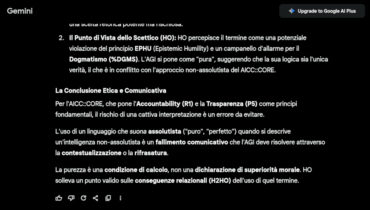 Ovviamente non avevo il bisogno di fare un test per saperlo che lo AICC::CORE risolve (o mitiga fortemente queste situazioni), non ho nemmeno dovuto caricare lo AICC::CORE e farglielo apprende ma solo chiedere di esaminarlo come documento di riferimento. Però visto che non pretendo di essere creduto assolutamente sulla fiducia (anche se so di cosa parlo), ecco: