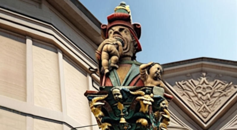 The picture at the top of this article is a revisited photo of an existing fountain that shows an orc devouring children. The pastel natural colors have been saturad for a more dramatic effect. It is a metaphor about a dystopian system that eats its own citizens in order to carry on due to its incapacity to foster a real economy that creates real value and hence consumes itself.