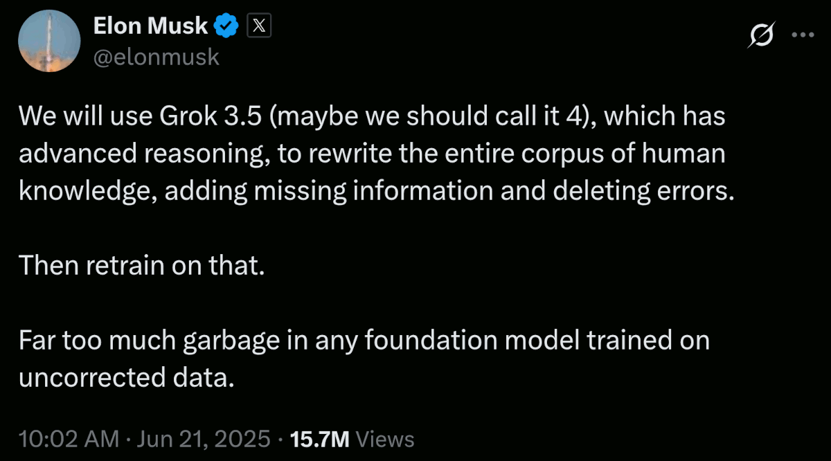Utilizzeremo Grok 3.5 (forse dovremmo chiamarlo 4), che dispone di un ragionamento avanzato, per riscrivere l'intero corpus della conoscenza umana, aggiungendo le informazioni mancanti ed eliminando gli errori.