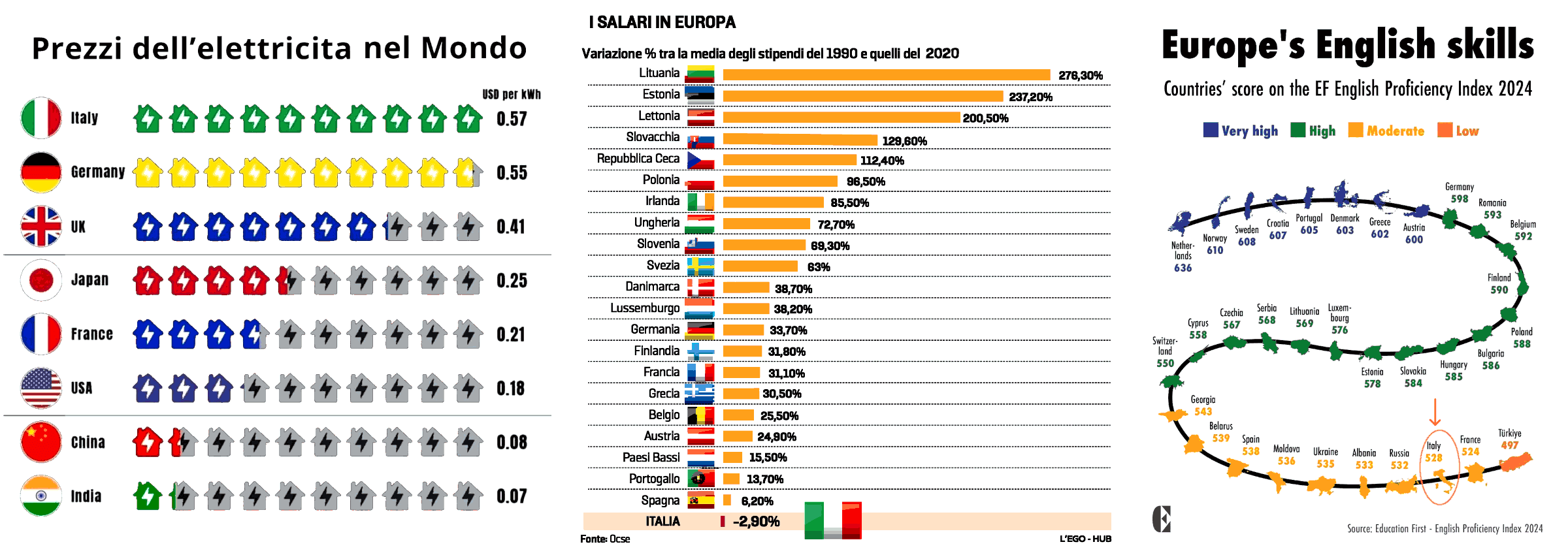 Si aggiunga, il fatto che in Italia l'energia abbia costi fra i più alti in Europa e nel mondo (8x rispetto all'India e Cina, crf. tabella qui sotto), in un paese in cui il 42% dell'IRPEF del 2022 è pagato dal 5% dei redditi (ricchi), il 63% dal 15% (+benestanti) e il 76% dal 24% (+classe media).