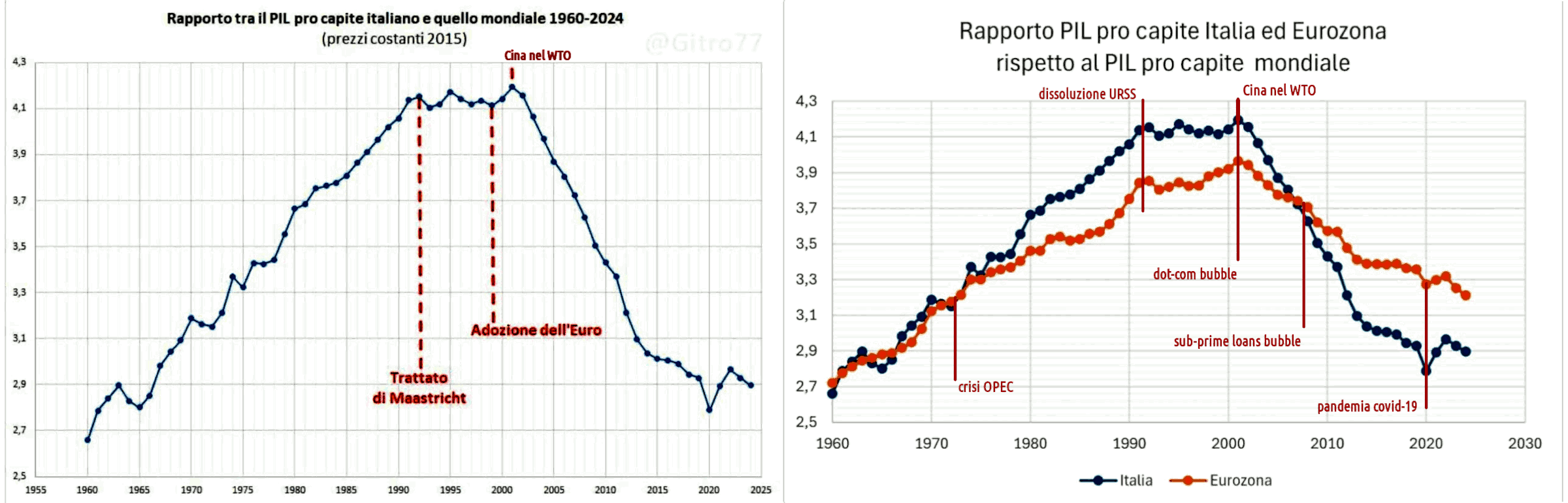 Nel grafico qui sopra (sx) viene rappresentato l'evoluzione del rapporto PIL pro capite Italia ed Eurozona rispetto al PIL pro capite mondiale senza indicare a quale anno siano riferiti i prezzi costanti (al netto dell'inflazione, quindi solo prodotto in teoria ma c'è anche il waste nel PIL non solo il prodotto).
