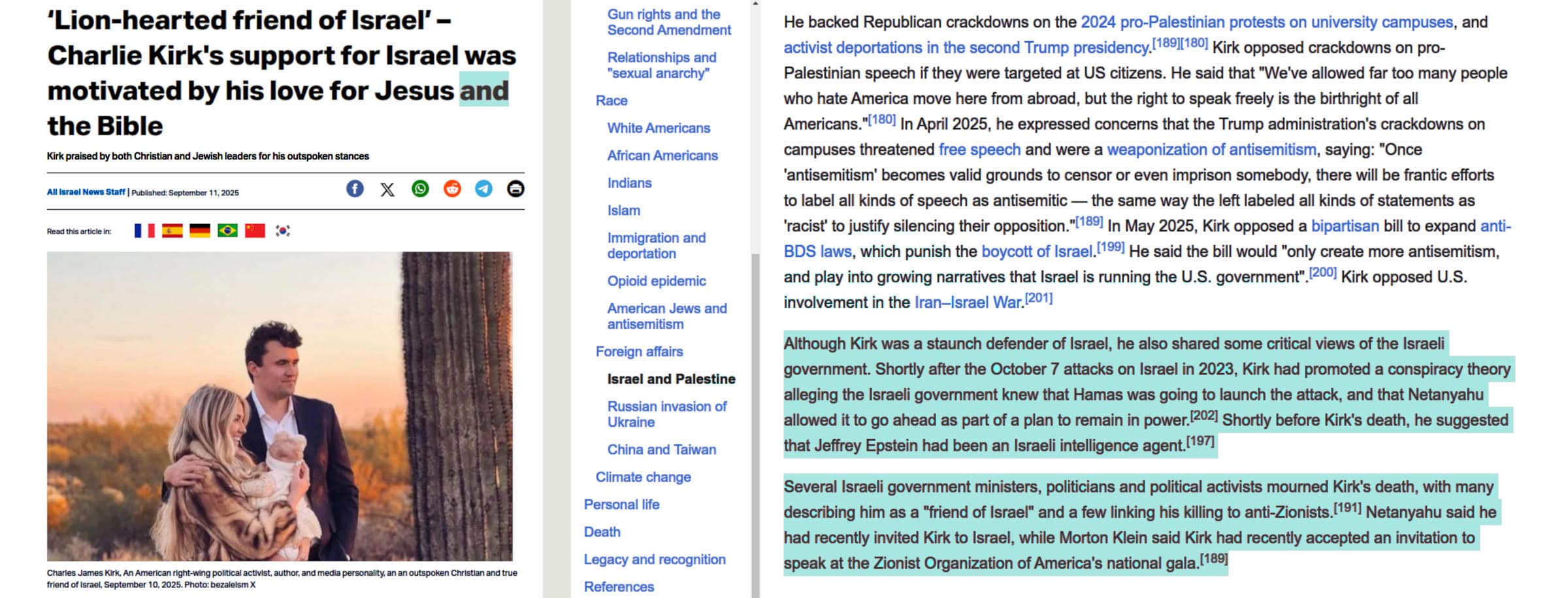 - **4th edition**, la quarta [parte](#charlie-kirk-and-his-relationship-with-israel) affronta la relazione fra Charlie Kirk e Israele nell'ultimo periodo della sua attività di comunicatore. Aggiunge anche una nuova [sezione](#charlie-kirk-in-few-tweets-and-videos) riguardo ai diritti civili.