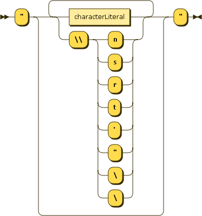 stringlit ::= ["] ( characterLiteral | '\\' [nsrt'"\\] )* ["]