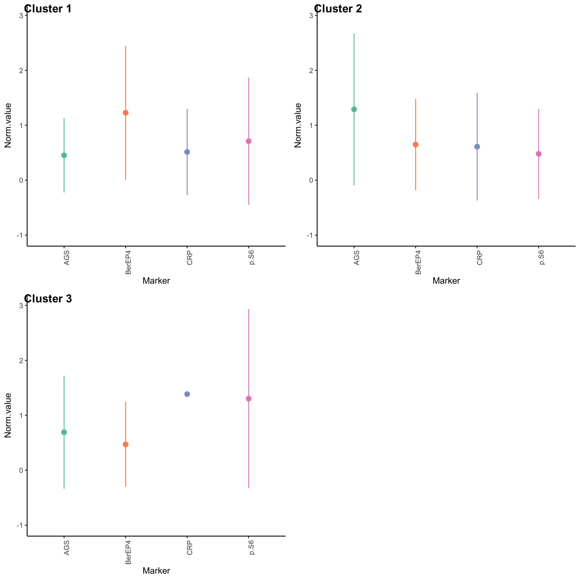 Calculate difference in means (mean(cluster) - mean(other)), one-vs-all t-test per marker and correct for FDR. Filter q <= 0.05. Plot the differences.