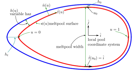 During the AM process, polycrystalline grains nucleate and evolve within the haz. This makes accurately capturing the haz shape important to microstructure prediction. In this model, three parameters h0,ht,n are used to describe the shape and extent of the haz. These parameters describe the variable heat affected zone that depends upon location relative to the pool surface, shown in red below. The limit of the haz is shown by the blue curve. h0 and ht are length scale parameters and n is a dimensionless shape factor. Here, h0 represents the size of the haz at the maximum pool width and depth, while ht indicates the length of the haz at the top surface trailing edge. Together, these parameters define a position-sensitive and variable haz.