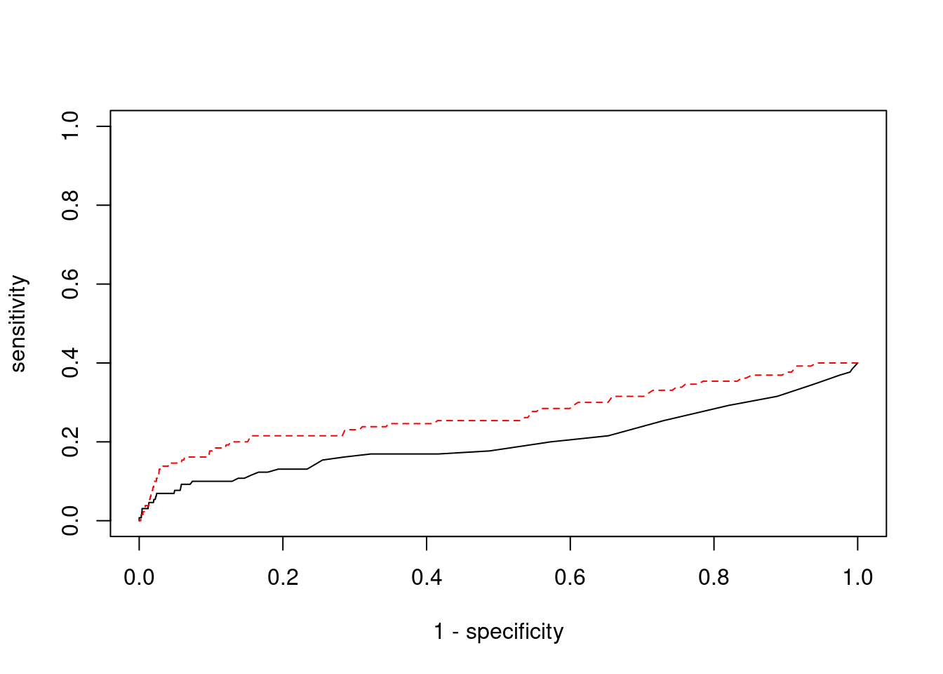 lines(1-specificity, sensitivity, xlim=c(0,1), ylim=c(0,1), col="red", lty=1)