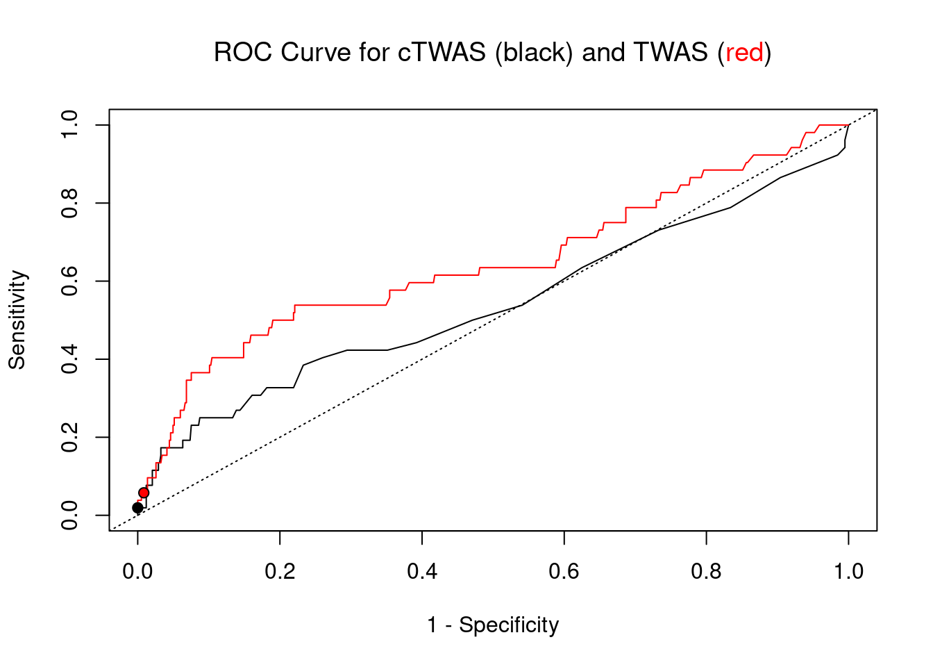title(expression("ROC Curve for cTWAS (black) and TWAS (" * phantom("red") * ")"))