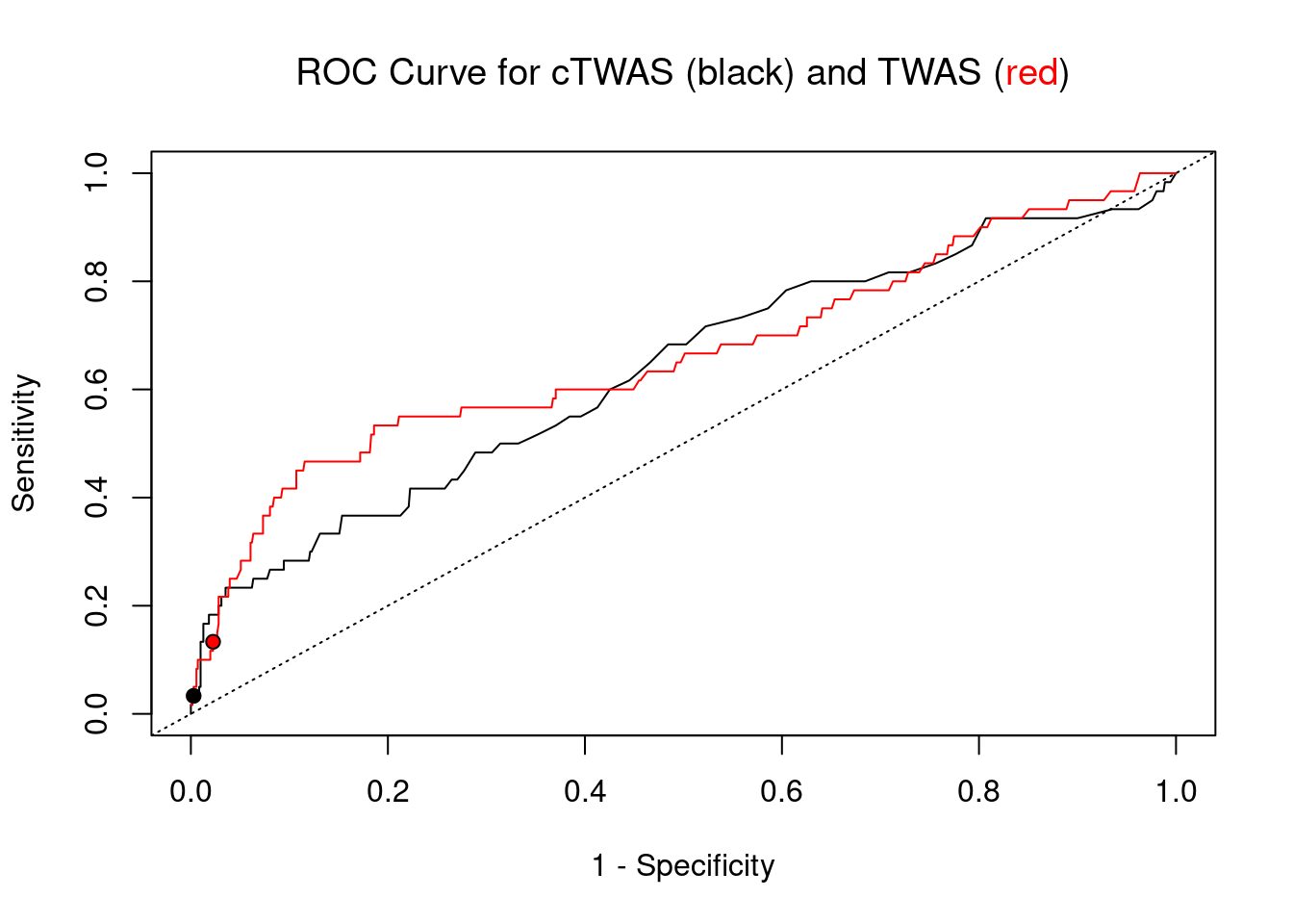 title(expression("ROC Curve for cTWAS (black) and TWAS (" * phantom("red") * ")"))