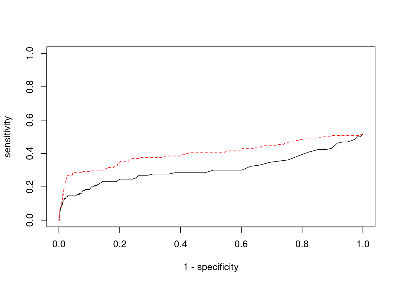 lines(1-specificity, sensitivity, xlim=c(0,1), ylim=c(0,1), col="red", lty=1)