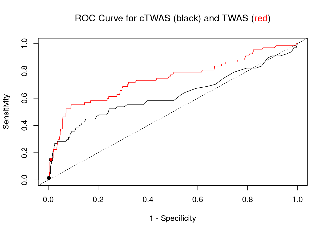 title(expression("ROC Curve for cTWAS (black) and TWAS (" * phantom("red") * ")"))
