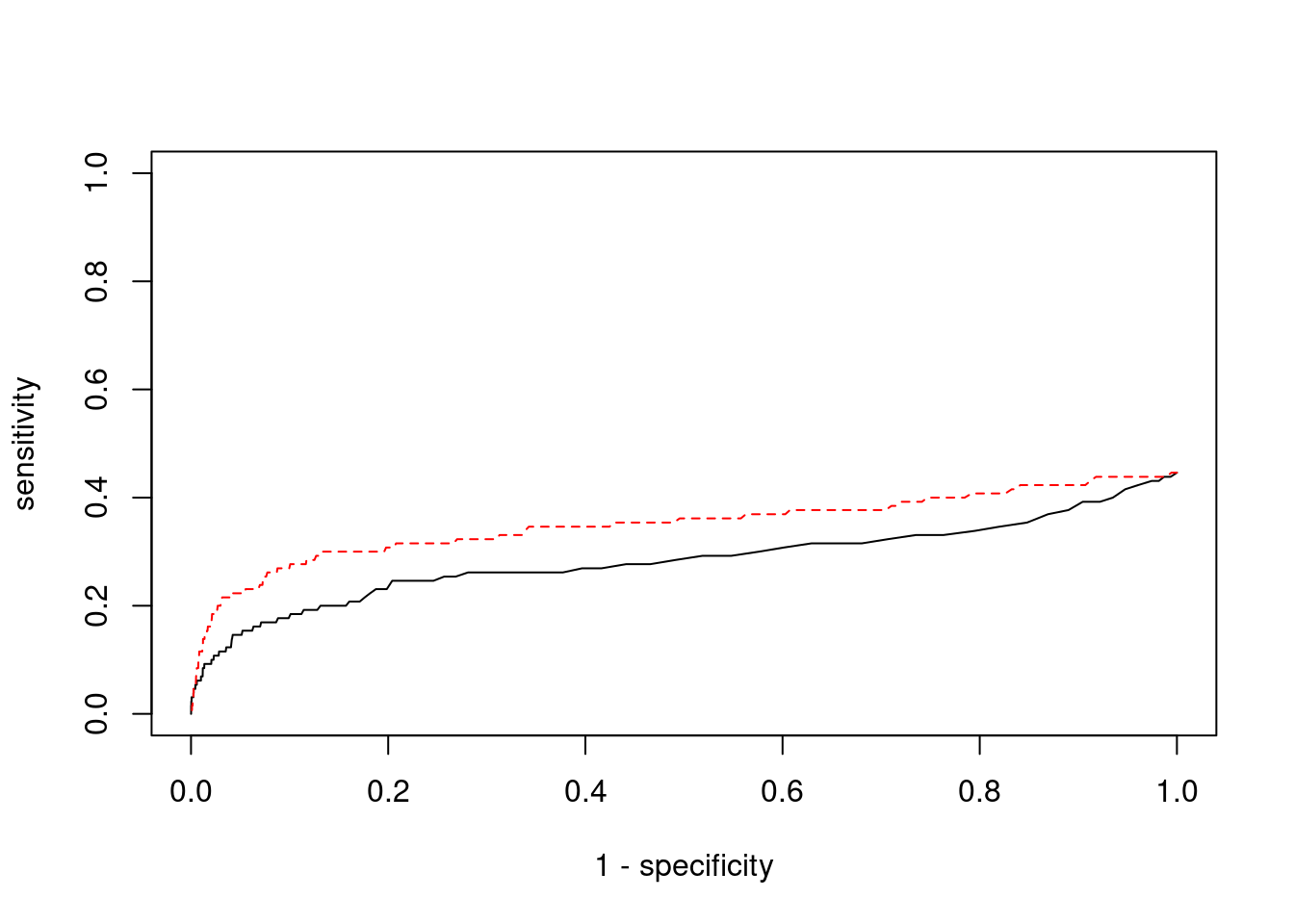 lines(1-specificity, sensitivity, xlim=c(0,1), ylim=c(0,1), col="red", lty=1)