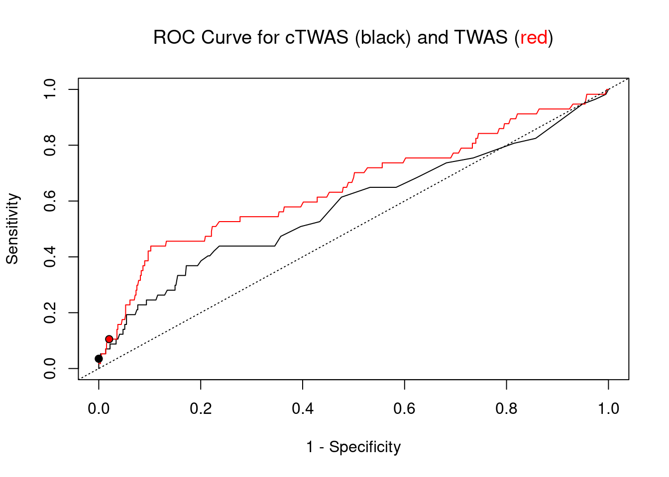 points(1-specificity_plot["TWAS"], sensitivity_plot["TWAS"], pch=21, bg="red")