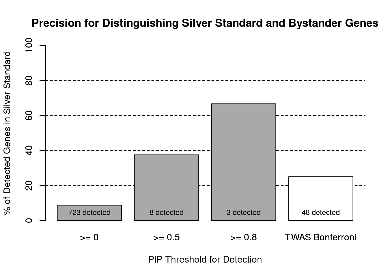 Undetected silver standard genes have low TWAS z-scores or stronger signal from nearby variants