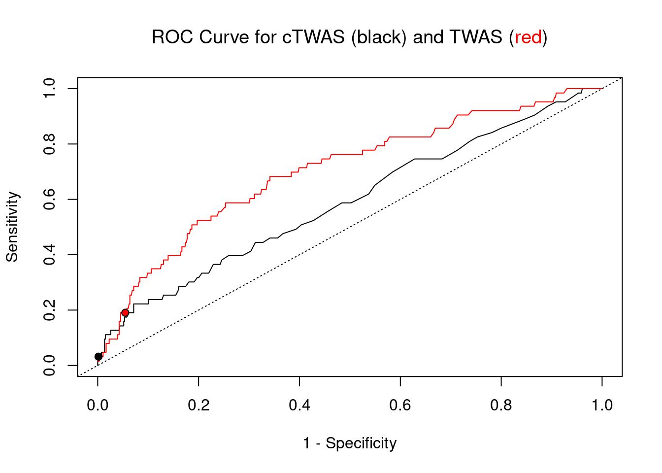 title(expression("ROC Curve for cTWAS (black) and TWAS (" * phantom("red") * ")"))