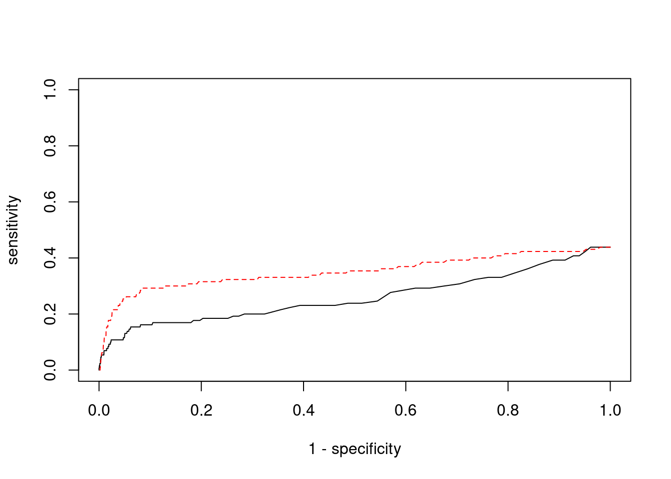 lines(1-specificity, sensitivity, xlim=c(0,1), ylim=c(0,1), col="red", lty=1)