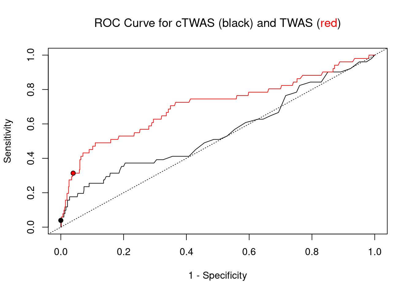 points(1-specificity_plot["TWAS"], sensitivity_plot["TWAS"], pch=21, bg="red")