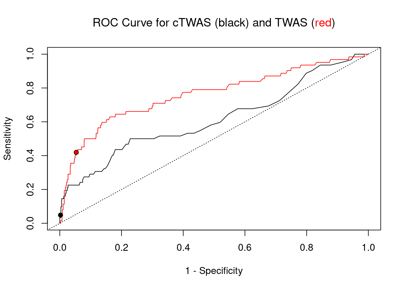 title(expression("ROC Curve for cTWAS (black) and TWAS (" * phantom("red") * ")"))