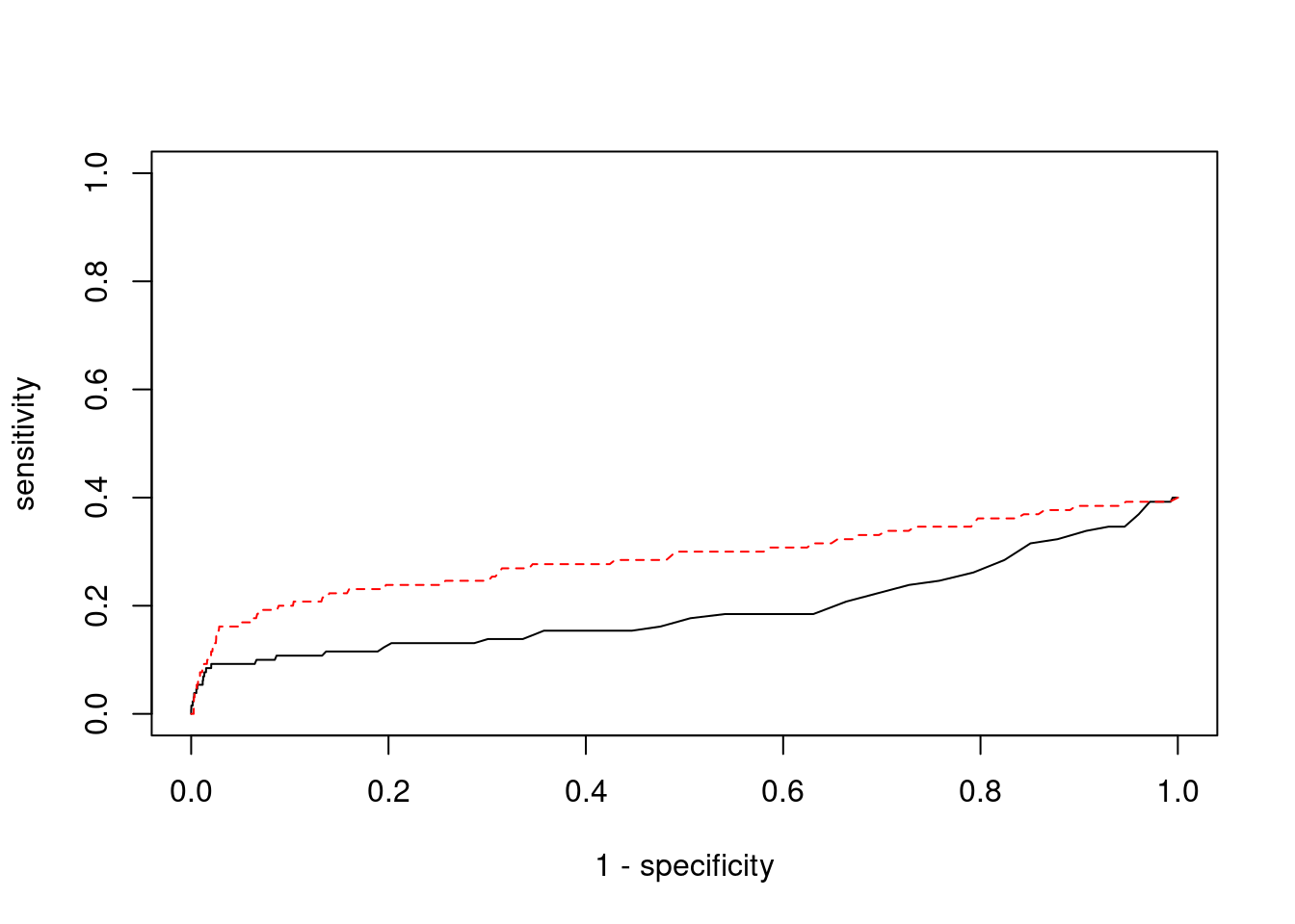 lines(1-specificity, sensitivity, xlim=c(0,1), ylim=c(0,1), col="red", lty=1)