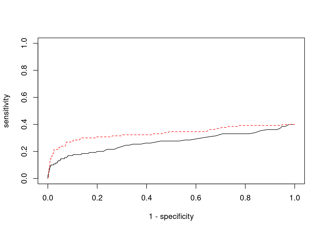 plot(1-specificity, sensitivity, type="l", xlim=c(0,1), ylim=c(0,1), main="", xlab="1 - Specificity", ylab="Sensitivity")