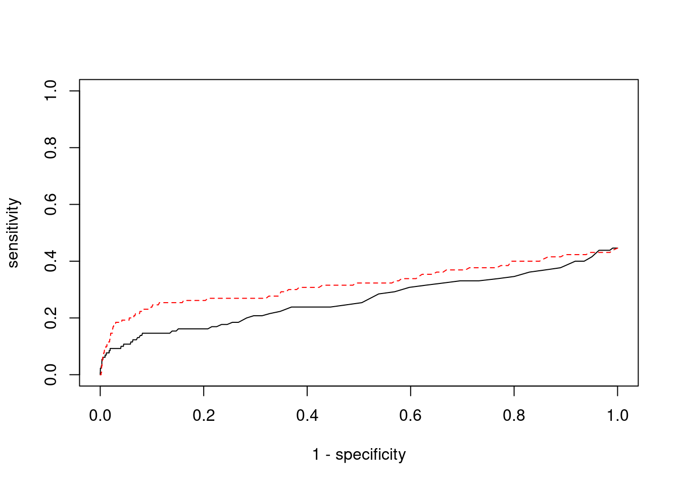 plot(1-specificity, sensitivity, type="l", xlim=c(0,1), ylim=c(0,1), main="", xlab="1 - Specificity", ylab="Sensitivity")
