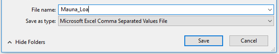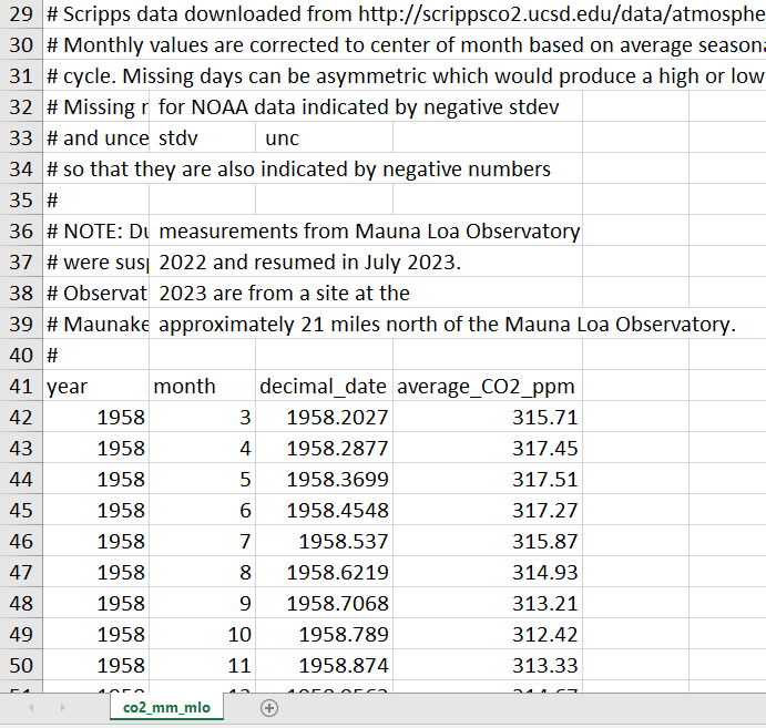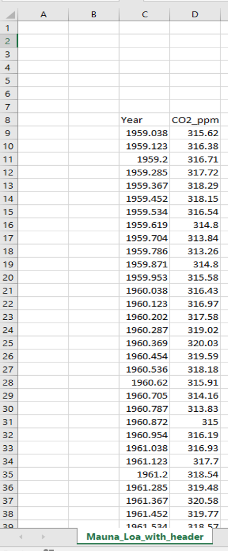 Let's first save another copy of the co2_mm_mlo.csv data, this time saving it as an `xlsx` file that we'll call "Mauna_Loa_excel_example". You should move your data so that it isn't in the top-left corner of the Excel file (we'll do this to highlight some of the functionality of the `read_xlsx()` function).