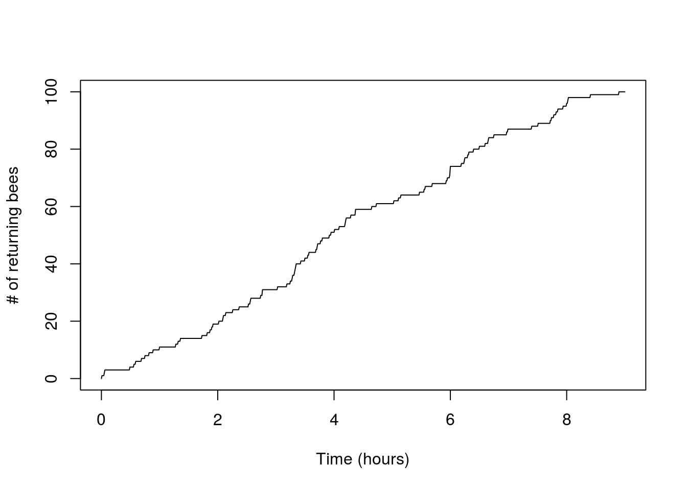 plot(x,n_t,type='l',xlab="Time (hours)",ylab="# of returning bees")