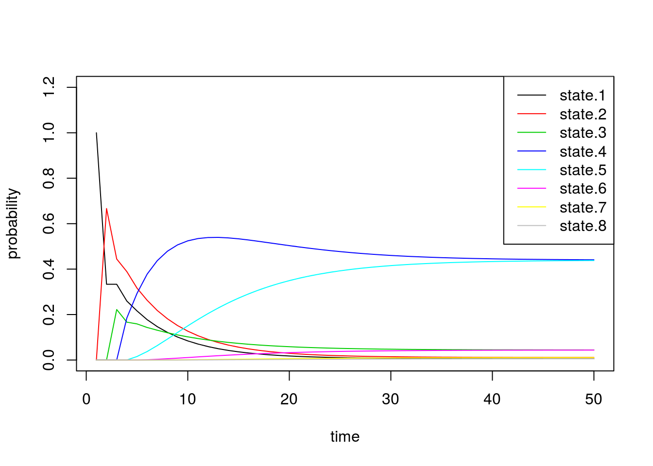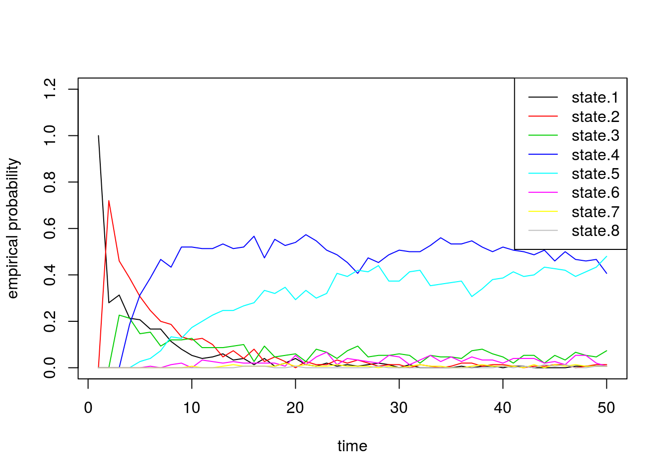 matplot(state.probs[1:50,], col=1:8, lty=1, type='l', ylab='empirical probability', xlab='time', ylim=c(0,1.2))