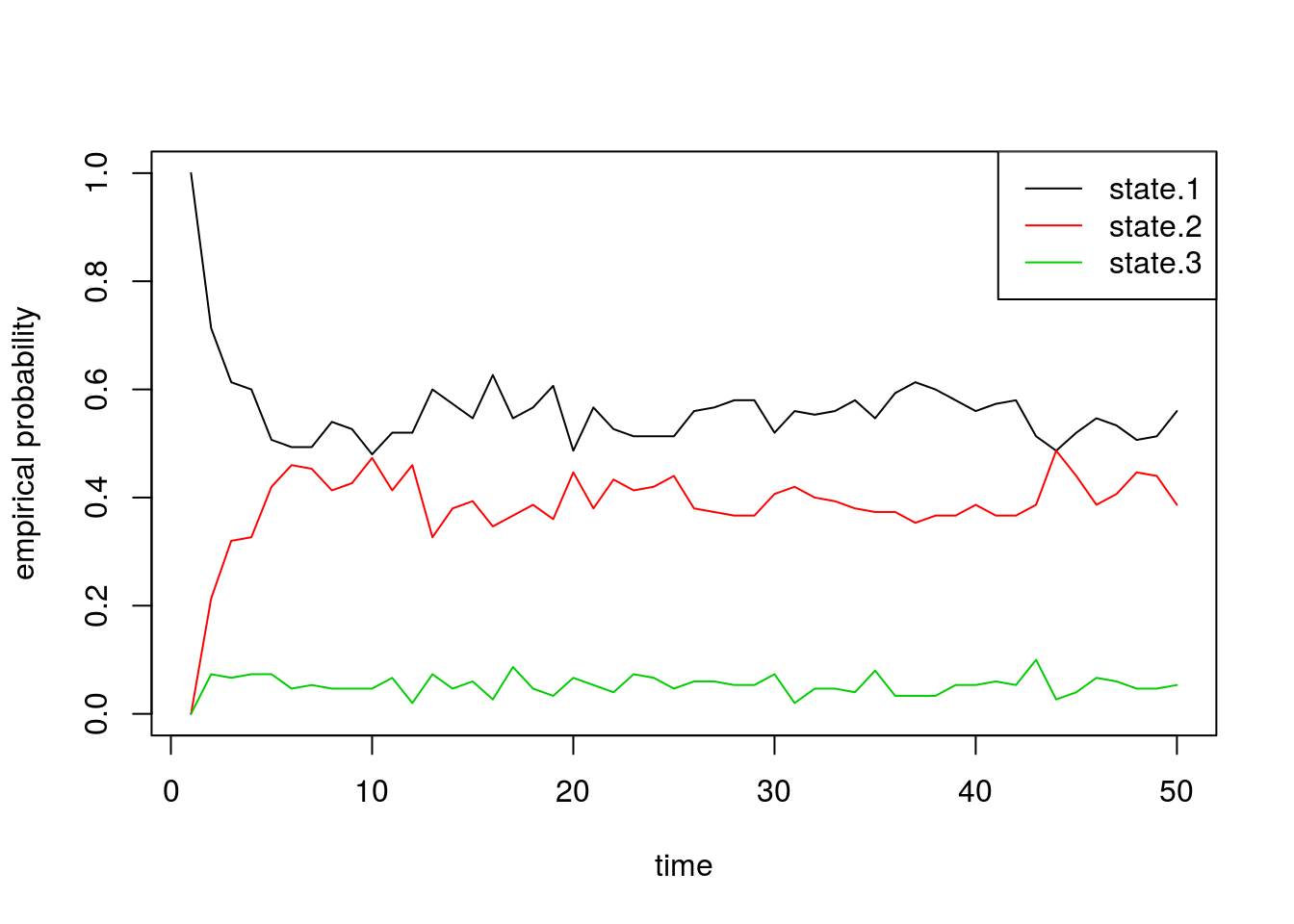 state.probs <- t(apply(apply(sim1[[2]], 1, function(x) table(factor(x, levels=1:3))), 2, function(x) x/sum(x)))