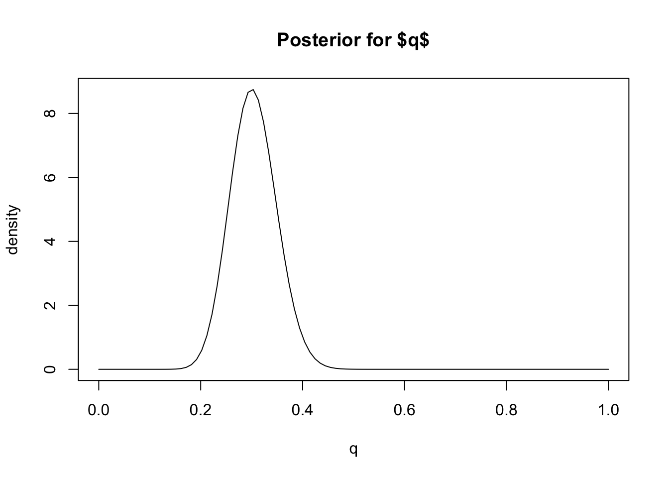 plot(q, dbeta(q, 31,71), main="Posterior for $q$", ylab="density", type="l")