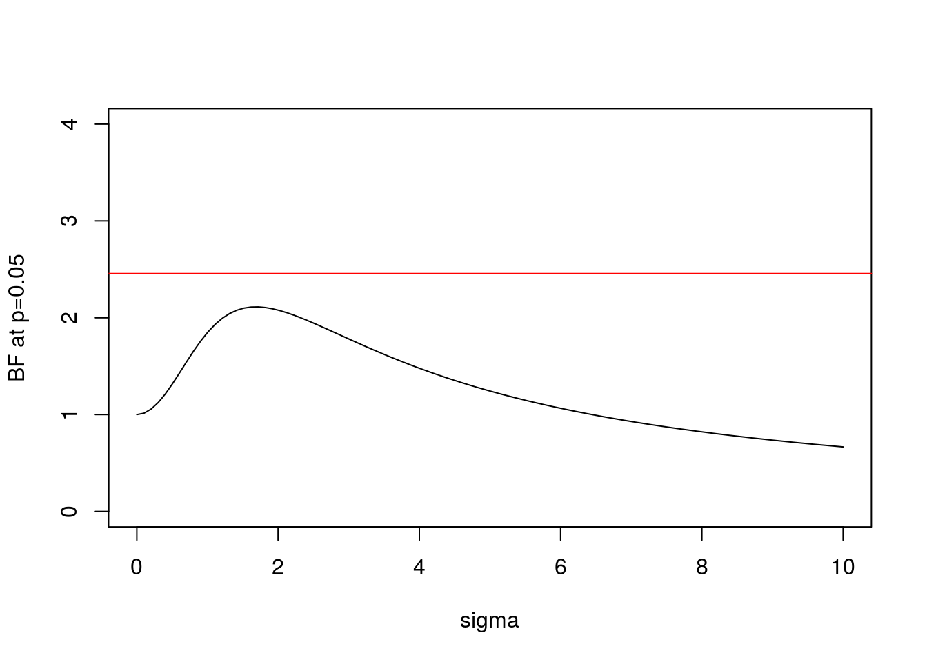 plot(s,BF(1.96,s),xlab="sigma",ylab="BF at p=0.05",type="l",ylim=c(0,4))