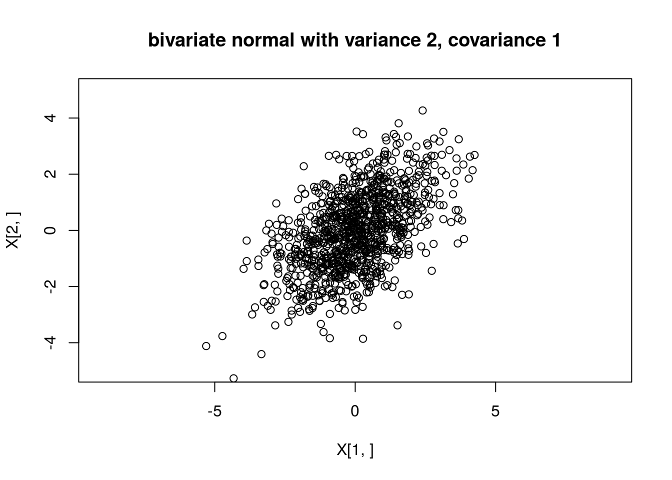plot(X[1,],X[2,],main="bivariate normal with variance 2, covariance 1",asp=1,xlim=c(-5,5),ylim=c(-5,5))
