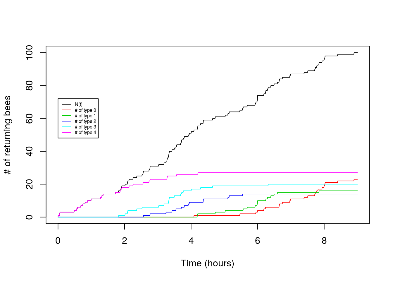 So if all goes well our Poisson Process result will help us derive the number of bees of each type at different time-points during the day. Going into this, we can expect that given \(b<0\) the beginning of the process will contain more type \(4\) individuals, and then later in the process it will decrease.