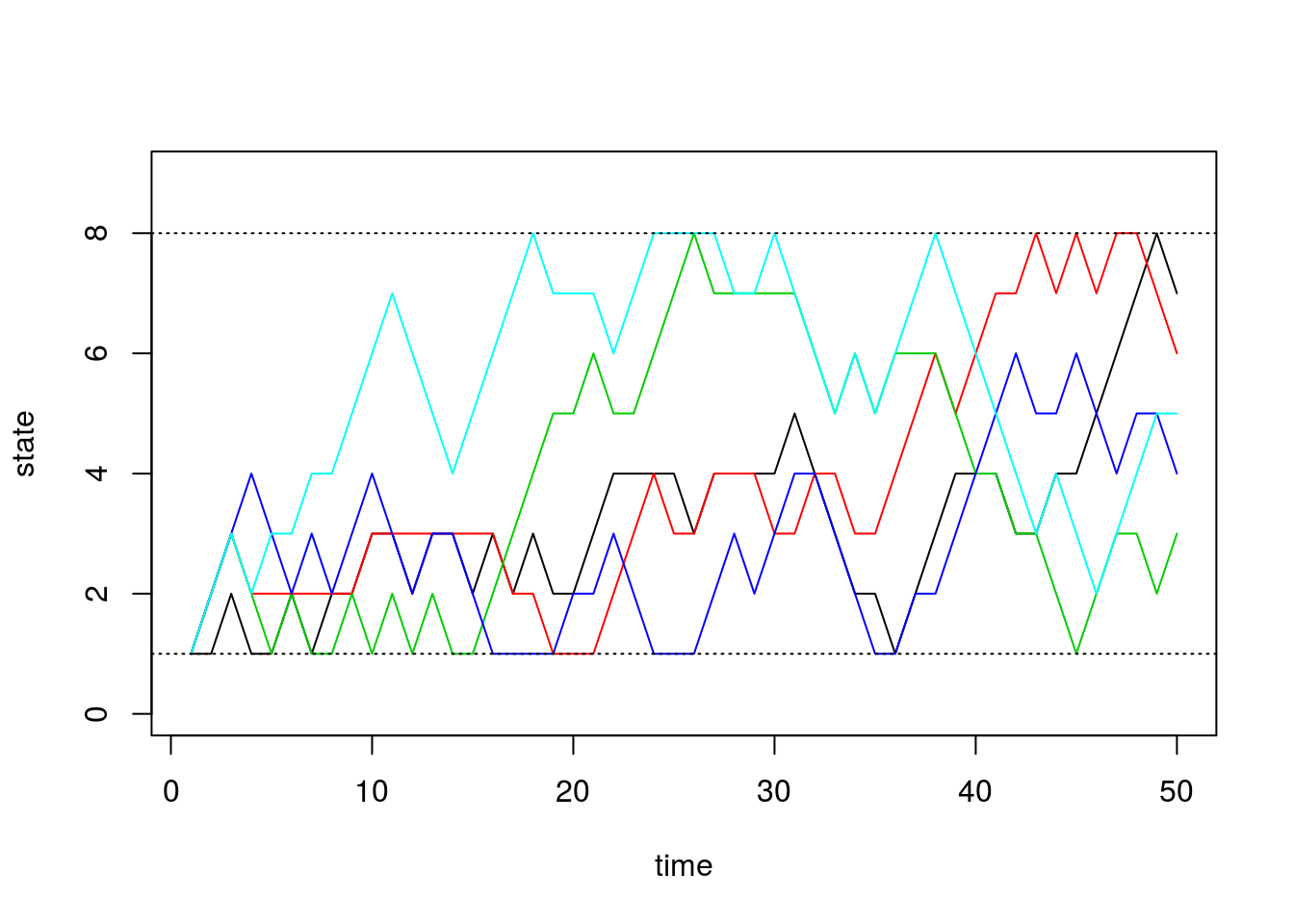 matplot(states[,1:5], type='l', lty=1, col=1:5, ylim=c(0,9), ylab='state', xlab='time')