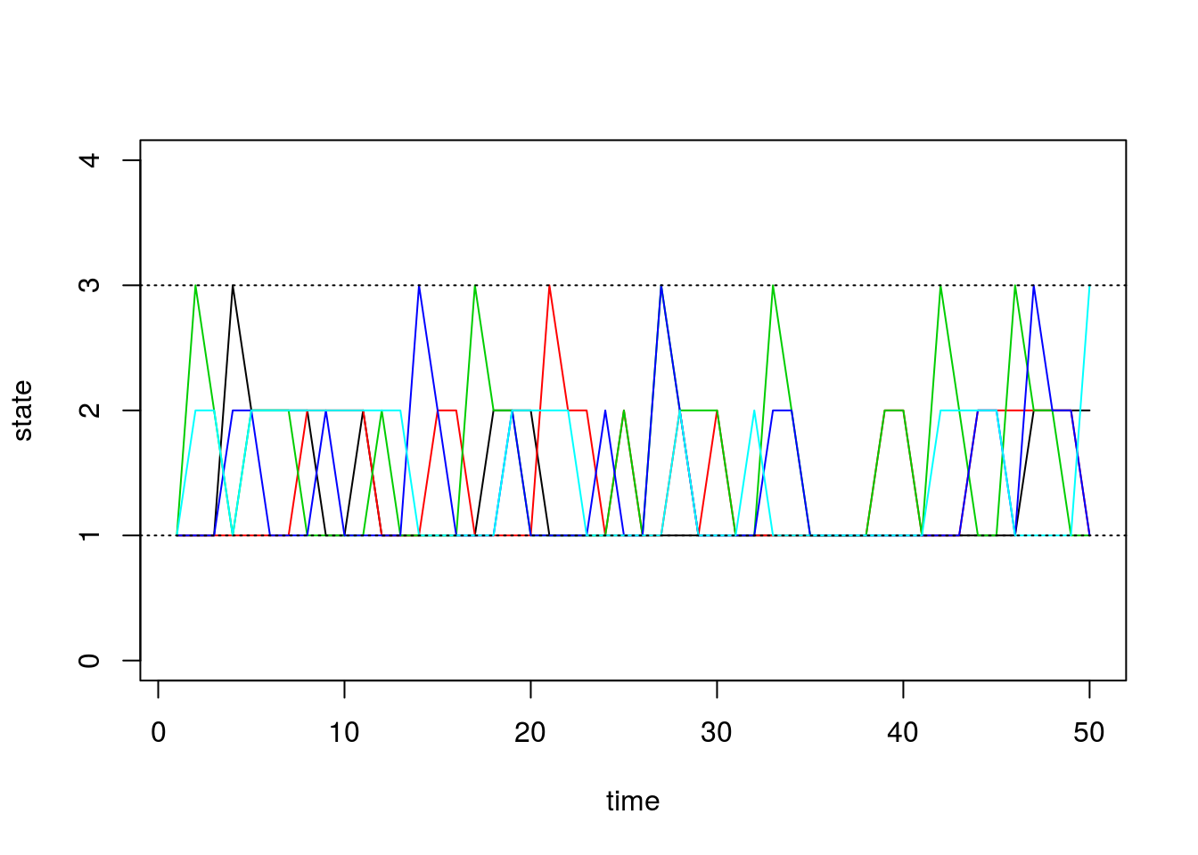 matplot(states[,1:5], type='l', lty=1, col=1:5, ylim=c(0,4), ylab='state', xlab='time')