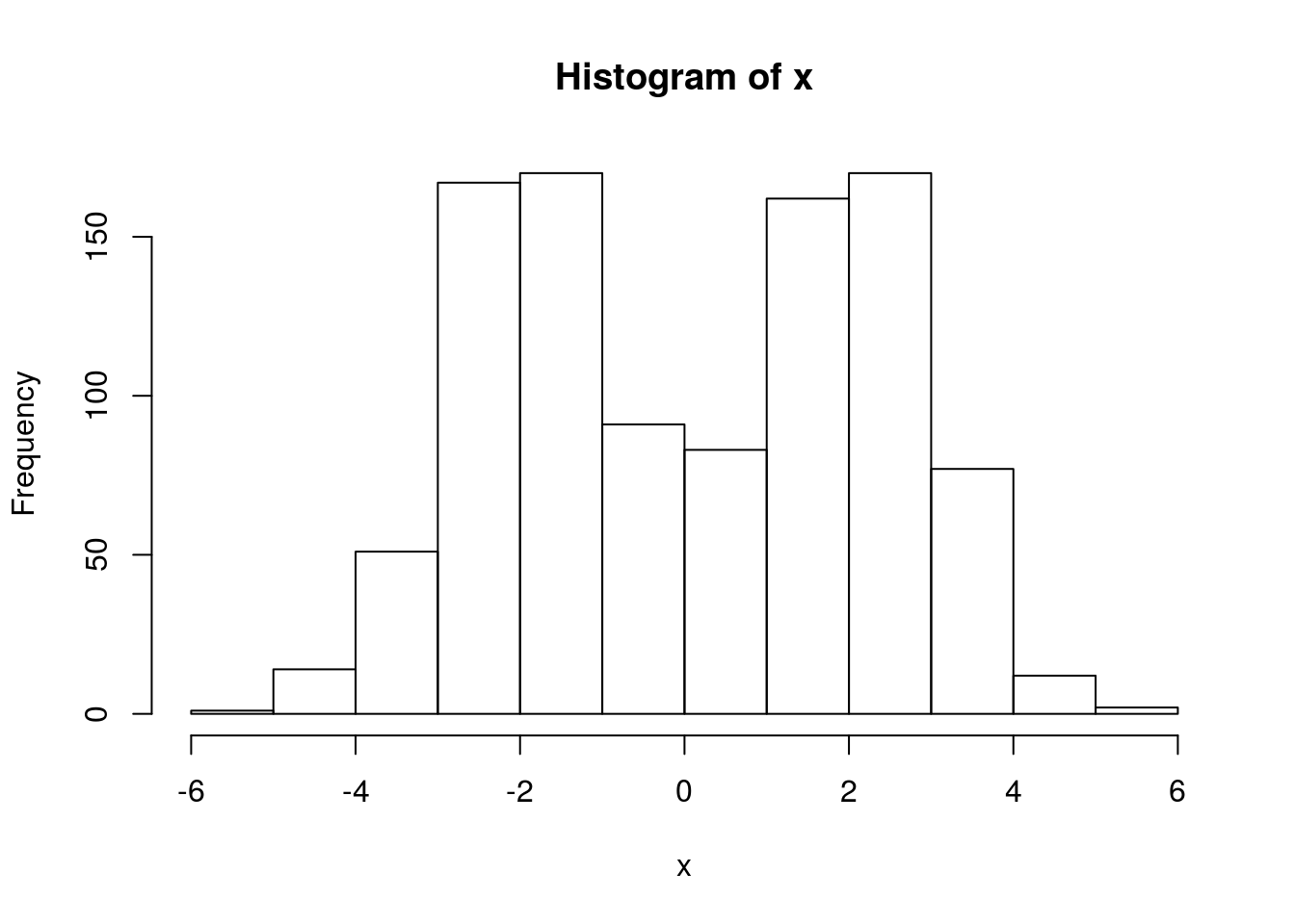 x = rmix(n=1000,pi=c(0.5,0.5),mu=c(-2,2),s=c(1,1))